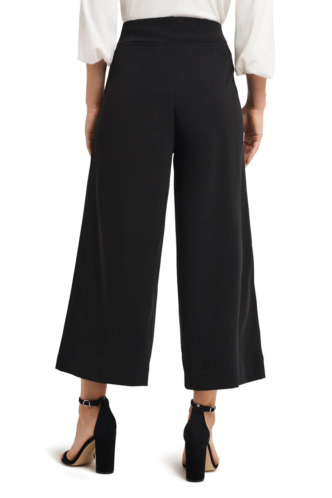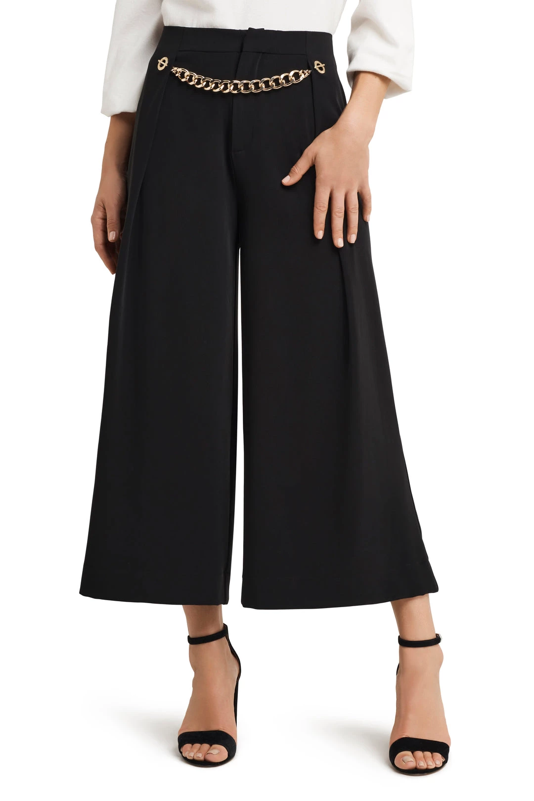 Wide leg cropped pant with pleating in front and removable chain detail. Side zip, 27″ inseam. 98% POLY 2% SPAN, Machine wash cold gentel cycle, tumble dry low or dry clean