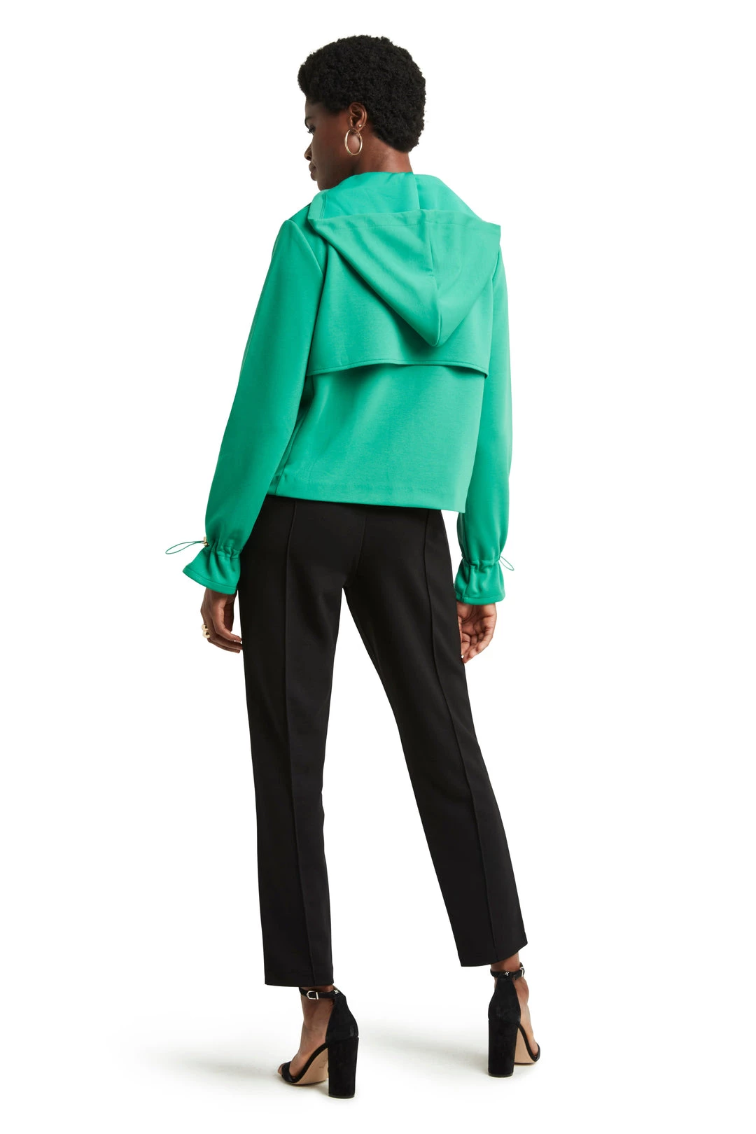 Long sleeve cropped trench jacket with hoodie. Double breasted snap closure, 27″ long. 100% Polyester, Machine wash cold gentel cycle, tumble dry low or dry clean