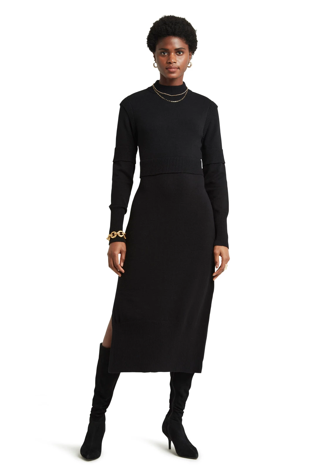 Long sleeve mockneck maxi dress with panel detail. 50% VISCOSE 28% POLYESTER 22% NYLON, 48″ long, Machine wash cold gentel cycle, tumble dry low or dry clean